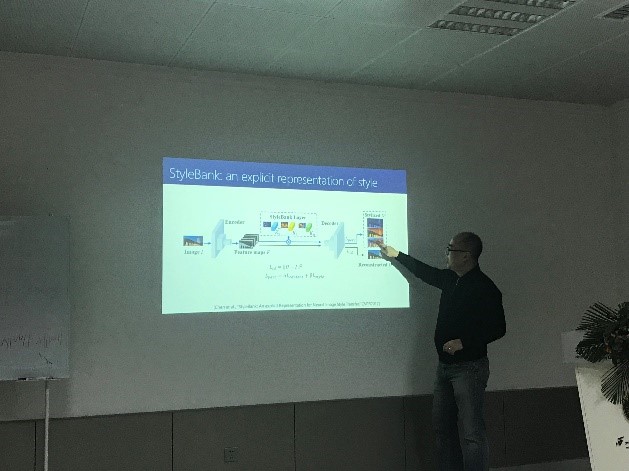 人工智能人才拔尖班的筹备情况。郑老师说,我们不仅需要培养一流的科学家,也需要培养一流的工程师,只有这样,才能真正推动人工智能研究的不断进步和发展。报告会上,华刚博士首先回顾了计算机视觉和模式识别研究的几个重要发展阶段。然后指出目前黑箱式的深度神经网络逐渐取代了传统的模块化分步式的视觉信息处理框架,虽然在识别等任务上的性能不断提升,但是其背后的理论依据比较匮乏,大部分研究人员仅将深度网络当作黑箱进行组合和重构来处理新问题。针对上述问题,华刚博士及其课题组希望从对视觉模式解构和理解的角度出发,通过引入特定域的知识来破解深度神经网络的黑箱,使研究人员能够有目的地控制深度神经的结构设计,并获得可理解的深度模型。例如,通过在自编码器中嵌入可替换的卷积核,对视觉风格模式解构,实现高效的图像艺术化风格自动转换。通过在生成对抗网络中嵌入自然语言的属性描述,对视觉信息的结构和类别模式解构,实现符合特定描述的图像生成。通过对最新研究成果的介绍,华刚博士表示,虽然追求识别性能的提升对于计算机视觉的研究具有重要意义,但是对视觉模式的解构和理解同样意义非凡,是我们不能忽视的重要研究方向。