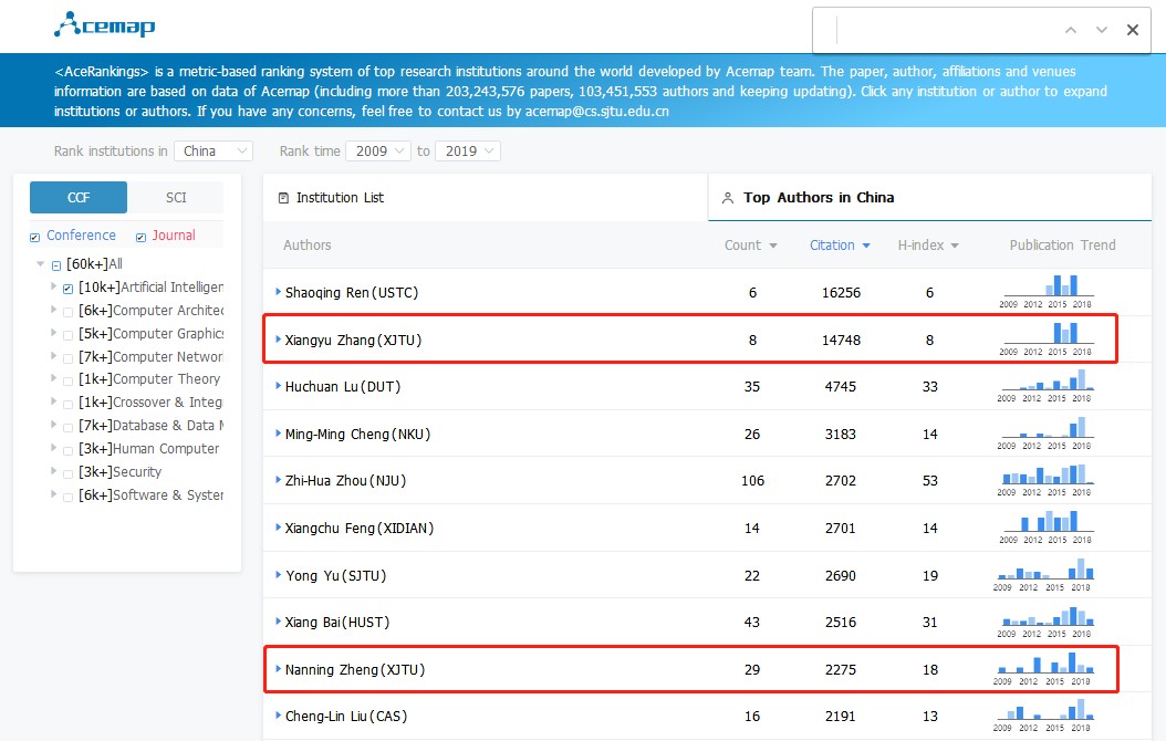 近日,上海交大Acemap团队开发了全球顶级研究机构排名系统AceRankings,该排名系统根据中国计算机学会(CCF)推荐的A类会议和期刊上发表论文的引用量,对中美Top 50的研究机构和相关学者进行了排名。我校在2009至2019年十年间论文引用量位居全国研究机构第五名,进入前五名的机构还包括:清华大学、中国科学院、中国科技大学和北京大学。