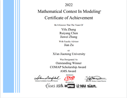 其中来自人工智能92班的陈睿阳同学所在队伍获得大赛Outstanding Winner奖(最高奖);人工智能001周嘉懿,人工智能92何雨萌、人工智能91卢佳源、人工智能92沈弋朝,人工智能91李应龙等同学所在队伍获得大赛Finalist奖(次高奖),Finalist中有一支队伍完全来自人工智能试验班;人工智能002李乾、人工智能001刘海若、人工智能001班祝泽宇、人工智能92班张文健等同学所在队伍获得Meritorious Winner奖。