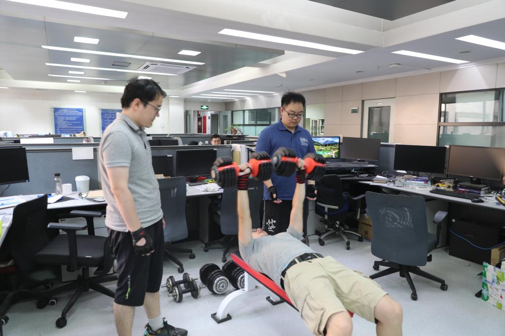 ,随处都能看到体育健身器材,工位旁摆放着健腹轮、划船机、哑铃等。在郑院士的团队里,“体育达人”层出不穷。“没事推两组?”是团队师生打招呼“常用语”,意思是要么卧推哑铃,要么站推健腹轮,一组12个。他们经常在工作学习间隙自发组织一场小型PK,参赛“选手”铆足劲把动作做标准,围观群众要么拍手称赞,要么也加入比赛。懂色帝